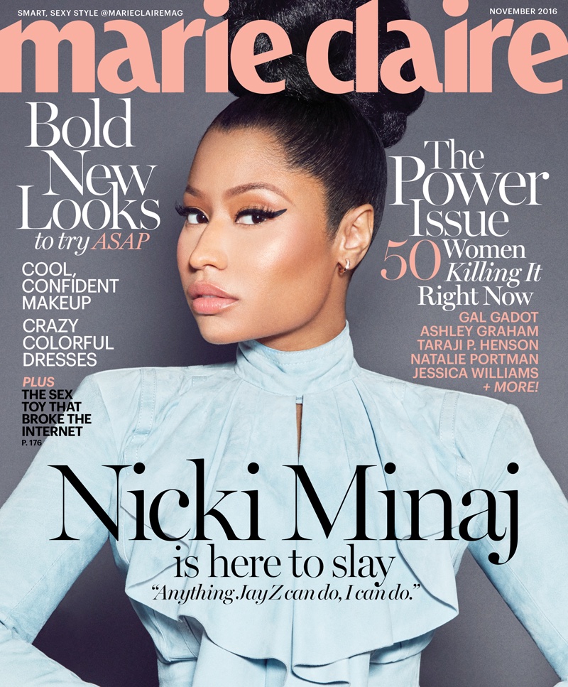 Ноемврийският брой на Marie Claire решава да посвети изданието си на жената с едни от най-острите езици в хип-хопа Ники Минаж. Корицата прави реверанс към Balmain, а между страниците виждаме певицата в стайлинг с други модни брандове, един от които е Marc Jacobs.